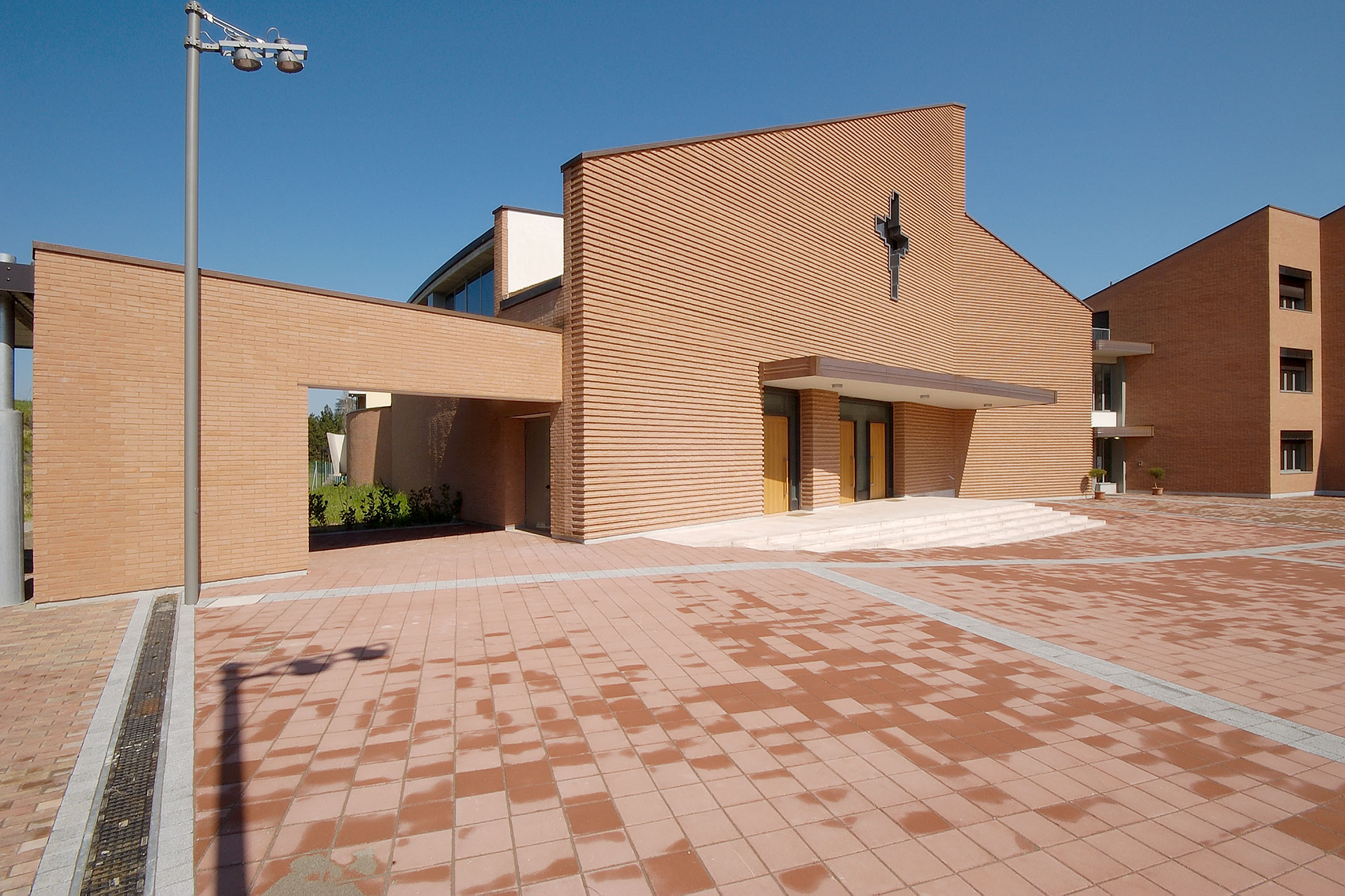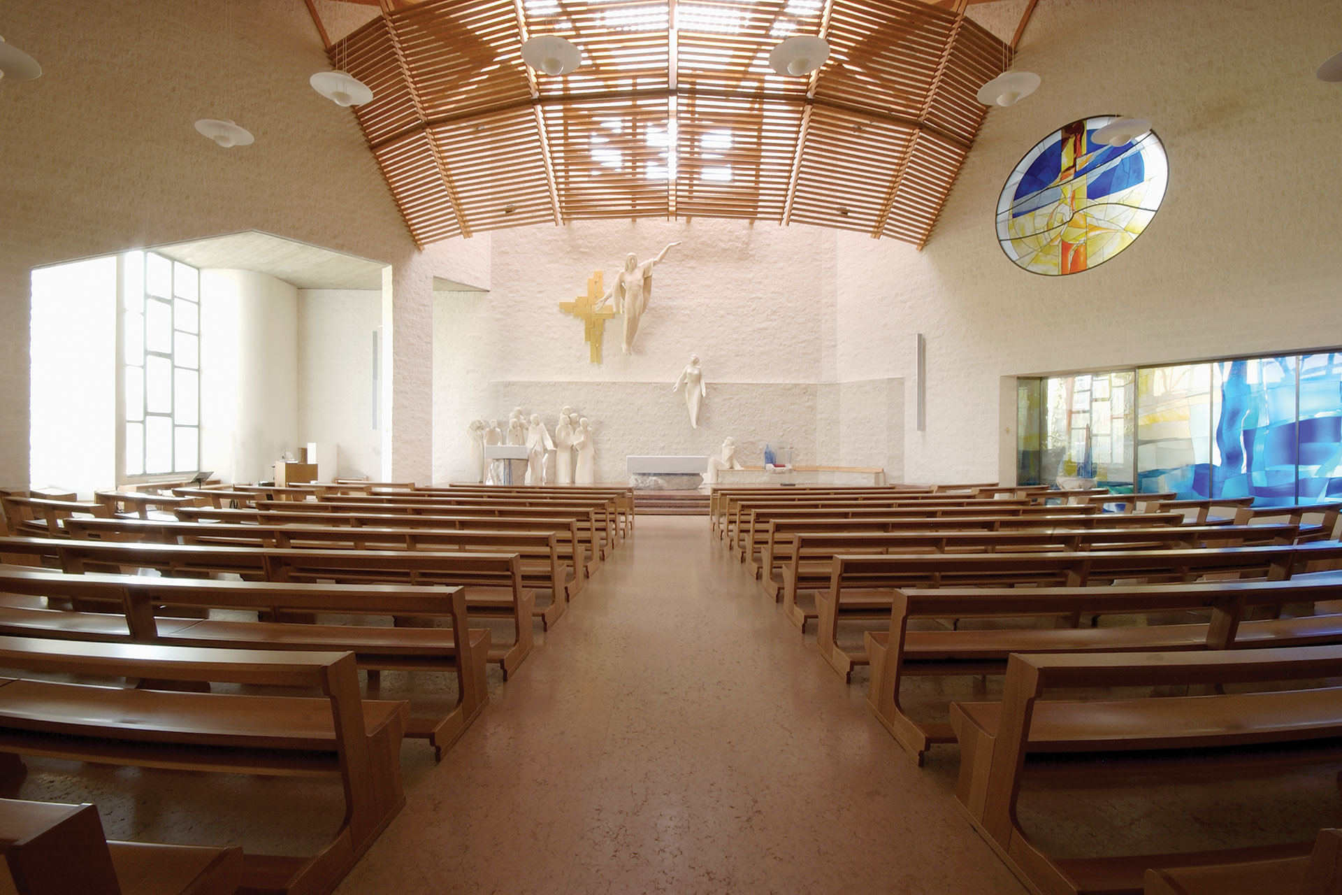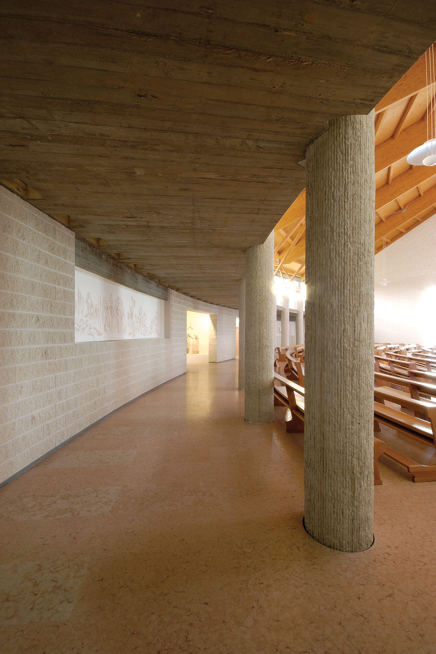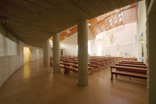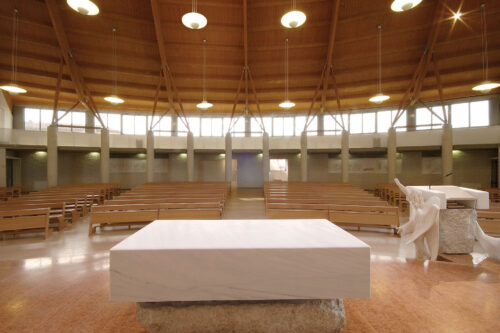 La Chiesa è composta da due aree distinte — Aula principale e Cappella feriale — collegate da un ampio atrio in continuità con il porticato esterno e con il sagrato. L’Aula principale ha una pianta semicircolare, più larga che lunga, studiata per favorire la partecipazione dei fedeli e garantire una buona visibilità dell’altare. La Cappella feriale, concepita come prolungamento formale dell’Aula, si trova a una quota leggermente inferiore rispetto all’atrio e presenta una luminosità attenuata, che ricrea l’effetto percettivo di una “cripta”. Al suo interno è riservato uno spazio centrale alla Custodia Eucaristica, separato dal luogo della celebrazione domenicale.