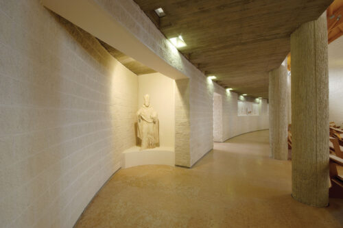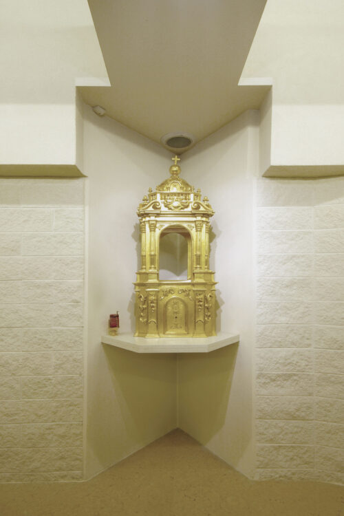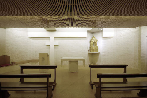 All’interno, diverse opere di Filip Moroder Doss, tra cui sculture, la via crucis e la croce di facciata, contribuiscono a rafforzare il senso simbolico e la percezione dello spazio sacro. L’architettura stessa è attentamente calibrata per l’impatto emotivo: ogni superficie, ogni sporgenza o rientranza, ogni luce e ogni filtro contribuiscono a un’esperienza significativa e orientata del luogo. Il progetto è stato completato con studi acustici e luministici, garantendo che l’ambiente rispondesse alle esigenze funzionali, liturgiche ed espressive.