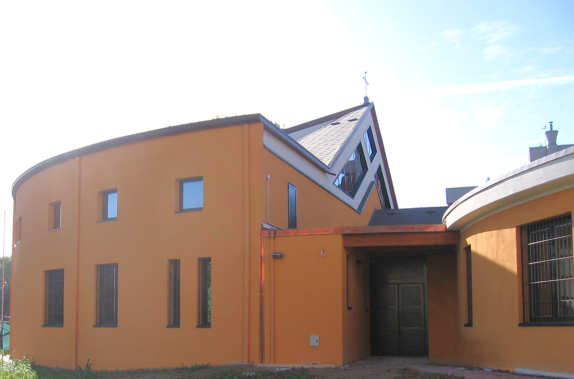 Le opere parrocchiali, adiacenti ma separate da giunto sismico, riprendono la stessa impronta semicircolare. L’edificio, in cemento armato con copertura in laterocemento e legno, accoglie gli spazi comunitari, pastorali e di servizio, pensati per le attività quotidiane della parrocchia.