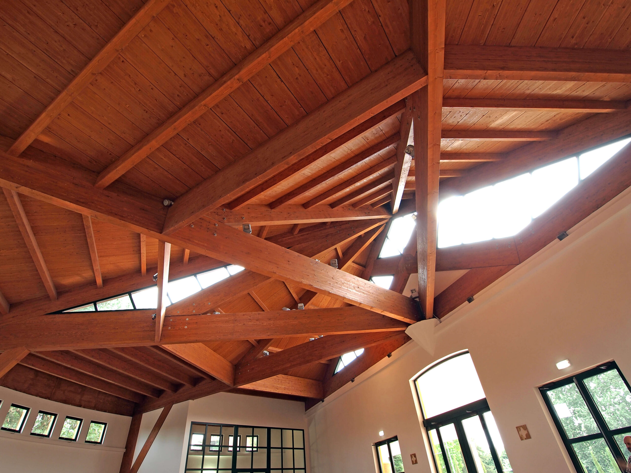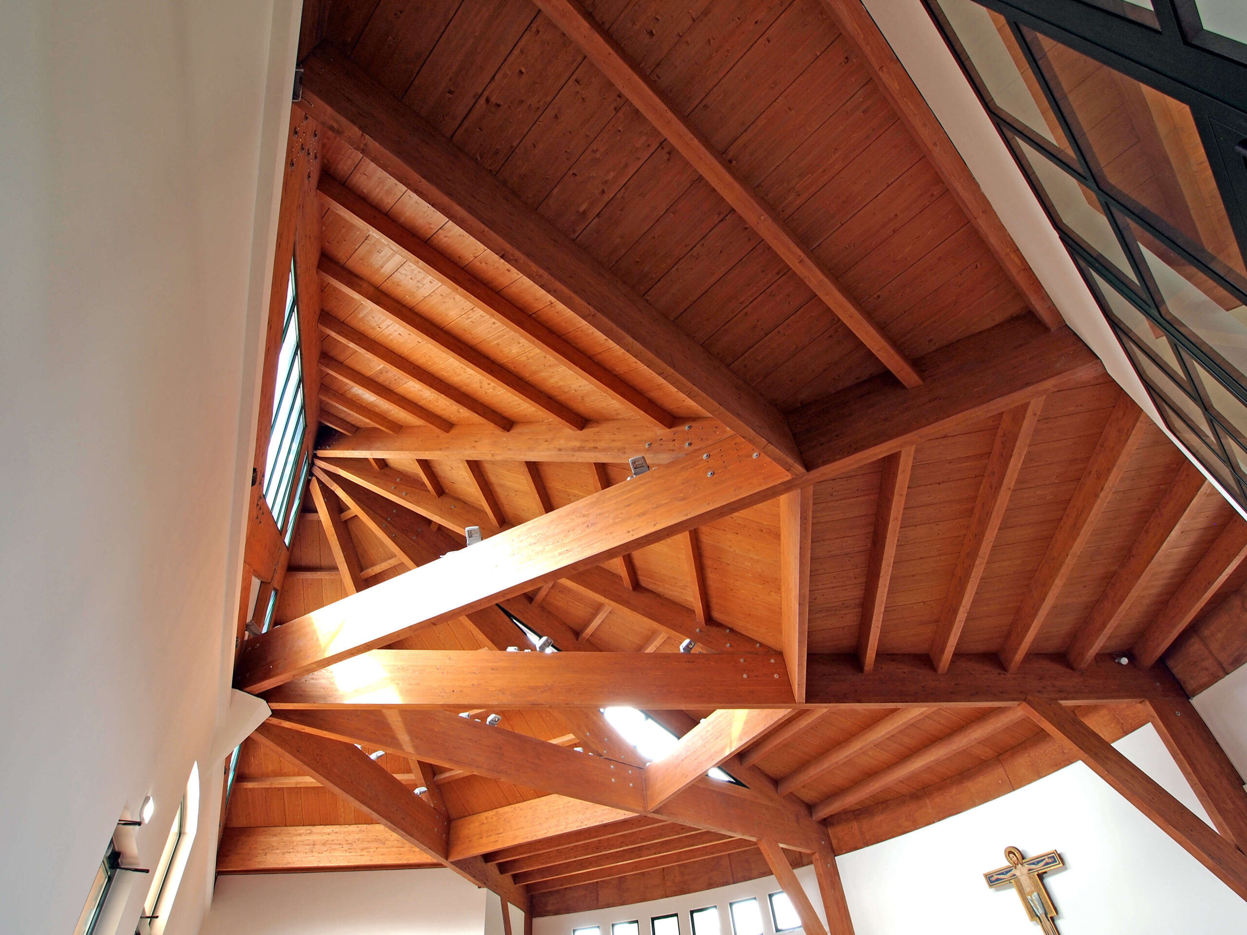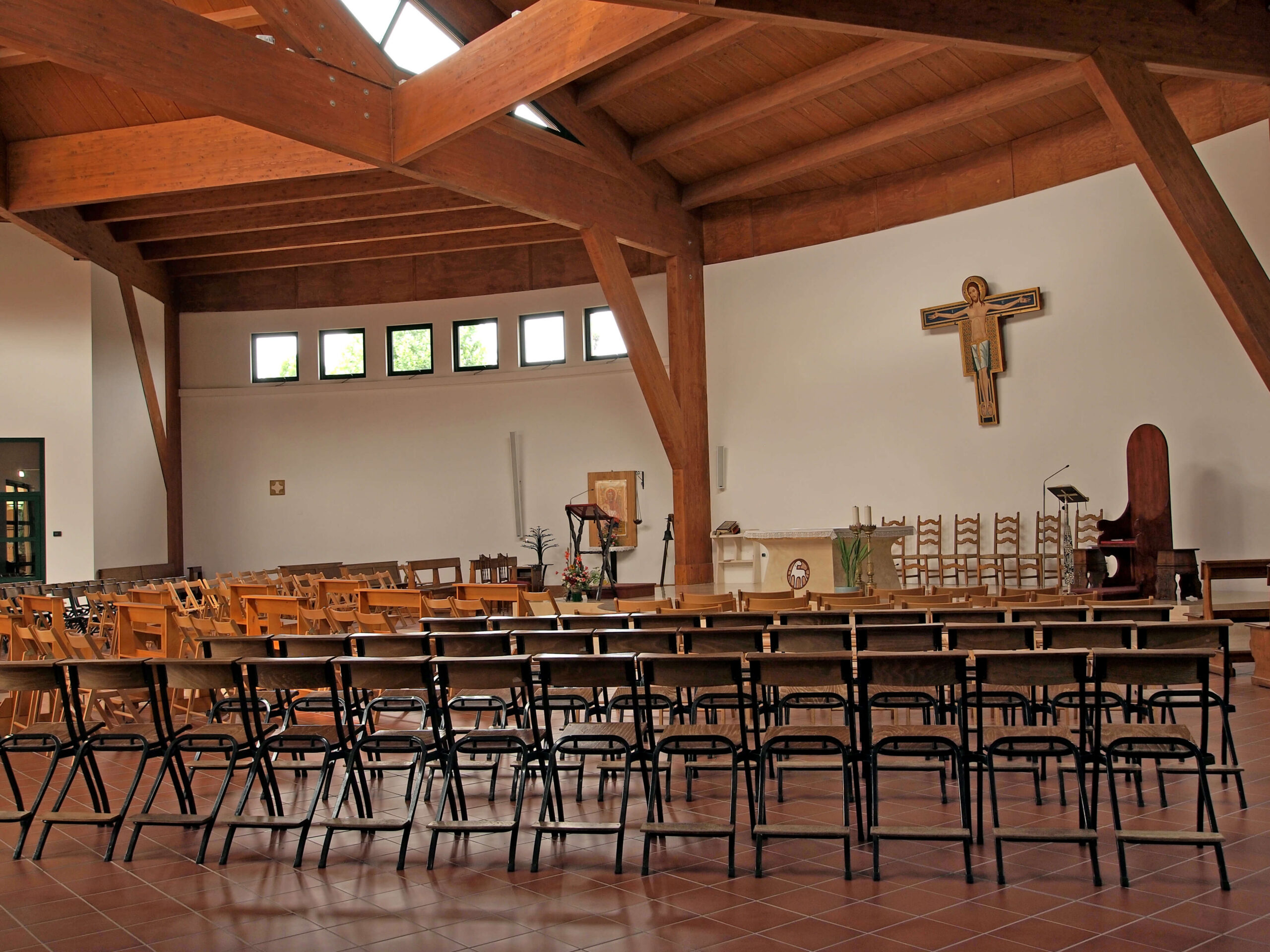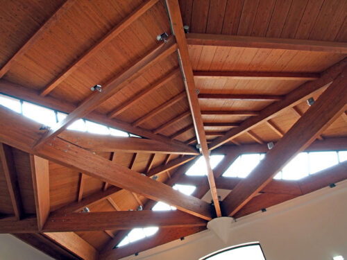 L’aula liturgica, cuore del progetto, presenta una pianta semicircolare e una struttura in cemento armato con copertura in legno lamellare. L’altezza varia dai 7 ai 12,7 metri, culminando in una parte centrale a forma piramidale che amplifica la luce naturale, contribuendo a creare un ambiente raccolto ma luminoso.
